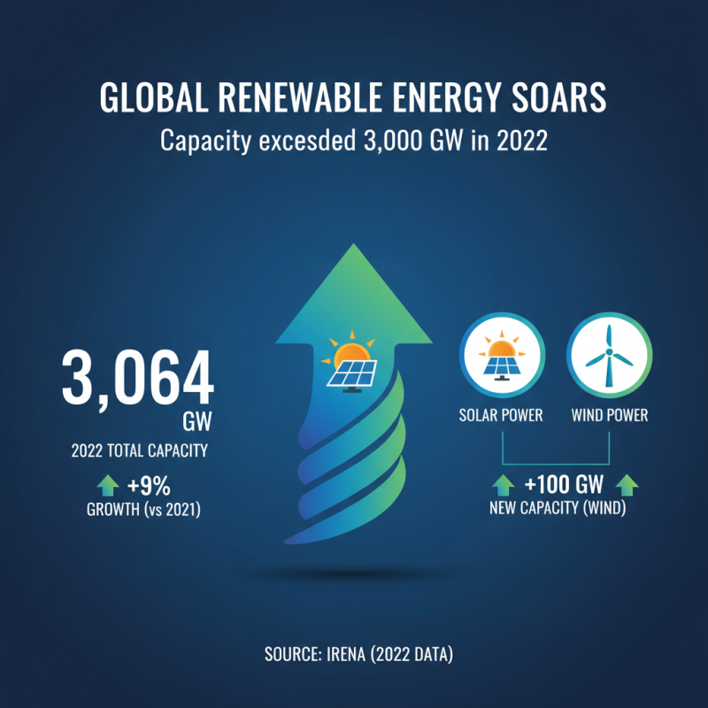Global renewable energy capacity is on the rise. According to the International Renewable Energy Agency (IRENA), global capacity reached 3,064 gigawatts (GW) in 2022. This represents a growth of over 9% compared to the previous year. Wind and solar power dominate this expansion. Wind power capacity alone increased by nearly 100 GW, illustrating its crucial role.